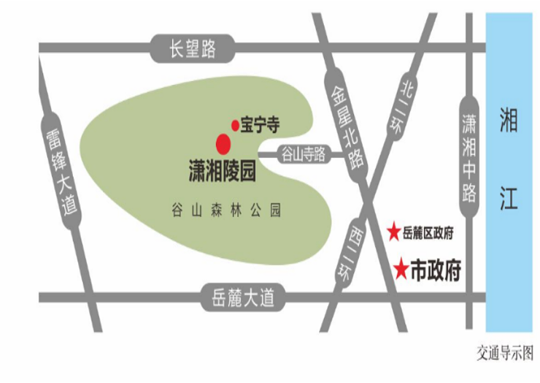 乘坐322路公交车,从湘江新区管委会(南)出发,与地铁2号线接驳,途径汽车西站(玉兰路枫林路口),走玉兰路上岳麓大道,市政府、八方小区,至谷山森林公园站(潇湘园)下,前行100米即到。